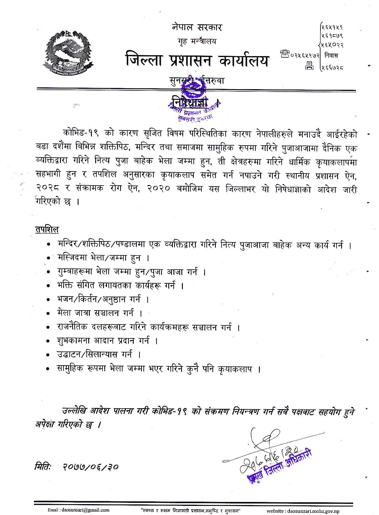 जसअनुसार मन्दिरमा भेला हुन मस्जिद, गुम्बा, भक्ती संगित लगायतका कार्यहरु गर्न, भजन, किर्तन, मेला जात्रा, राजनैतिक दलका कार्यक्रम, शुभकामना आदानप्रदान उद्घाटन र सामूहिक भेला हुन प्रतिबन्ध लगाइएको छ ।