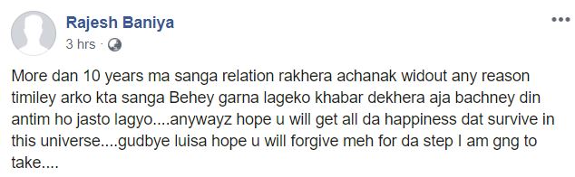 ‘१० वर्षभन्दा बढी समयदेखि मसँग सम्बन्ध राखेर विना कारण अचानक तिमीले अर्को केटासँग बिहे गर्न लागेको देखेर बाँच्ने दिन अन्तिम हो जस्तो लाग्यो । केही छैन, आसा छ तिमीले यो सबै खुशी तिमीलाई पाउने छौ । गूड बाइ इसु, आसा छ तिमीले मलाई माफ गर्नेछौं’, उनले सामाजिक सञ्जालमा भनेका छन् ।