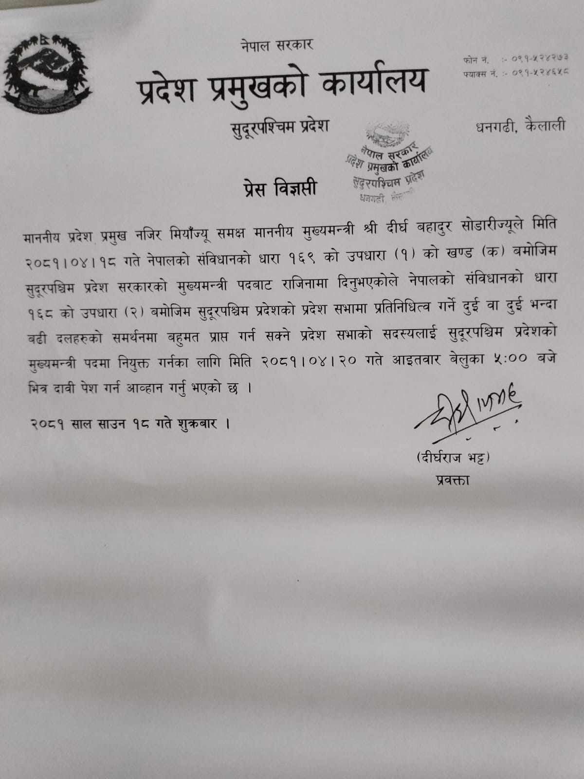प्रदेश प्रमुख कार्यालयका प्रवक्ता दीर्घराज भट्टले प्रदेश प्रमुखले संविधानको धारा १६८ को (२) उपधारा बमोजिम दुई वा दुईभन्दा बढी दलको समर्थनमा नयाँ सरकार गठनका लागि आह्वान गरेको विज्ञप्तिमार्फत जनाएका छन् ।