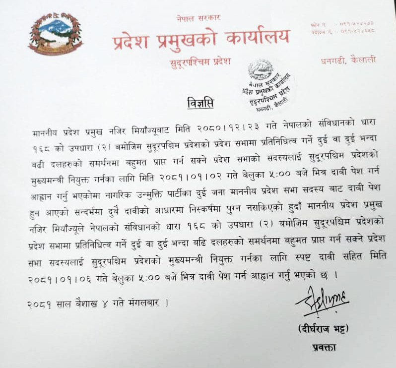 प्रदेश प्रमुख कार्यालयका प्रवक्ता दीर्घराज भट्टले मंगलबार साँझ विज्ञप्ति जारी गर्दै मुख्यमन्त्रीमा दाबी पेश गर्न पुनः आह्वान गरिएको जनाएका छन् ।