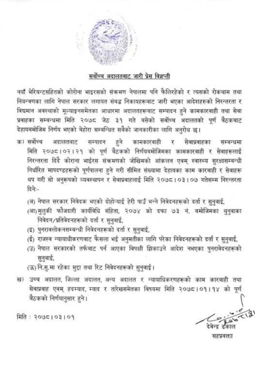 काठमाण्डु – कोरोना भाइरस संक्रमण कम हुँदै गएपछि सर्वाेच्च अदालतले आजदेखि सेवा विस्तार गरेको छ ।
