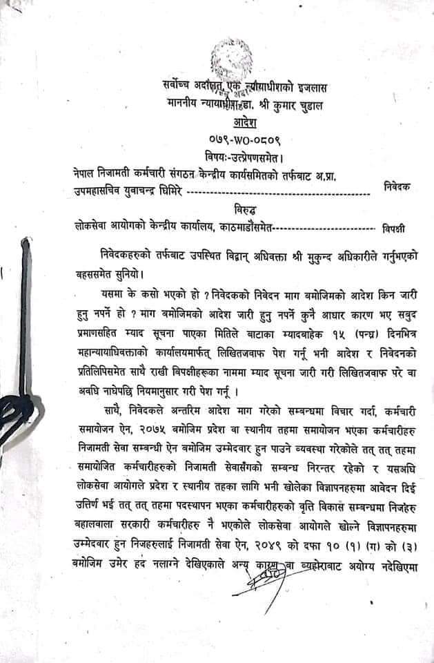 नेपाल निजामती कर्मचारी संगठनको तर्फबाट उपमहासचिव युवाचन्द्र घिमिरेले दायर गरेको रिटमाथि शुक्रबार सुनुवाइ गर्दै सर्वोच्चका न्यायाधीश कुमार चुँडालको एकल इजलासले लोकसेवाले दरखास्त आह्वान गरेका विज्ञापनमा बहालवाला कर्मचारीलाई सहभागी गराउन अन्तरिम आदेश दिएको हो ।