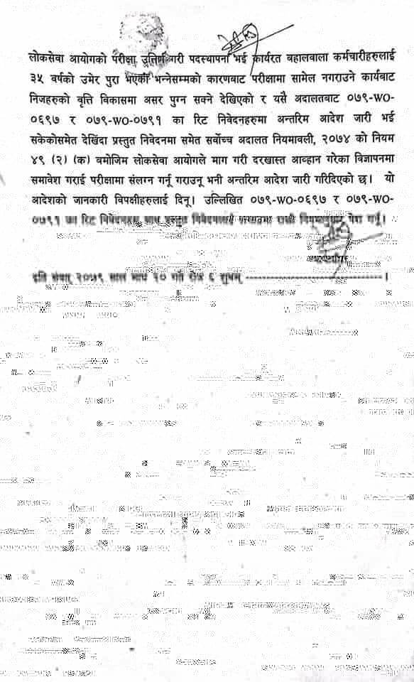 प्रदेश र स्थानीय तहमा समायोजन भएका कर्मचारीहरुलाई लोकसेवा आयोगले खोल्ने विज्ञापनहरुमा उमेर हद नलाग्ने ठहर गर्दै सर्वाेच्चले उनीहरुलाई लोकसेवाको परीक्षामा सहभागी गराउन अन्तरिम आदेश दिएको हो ।