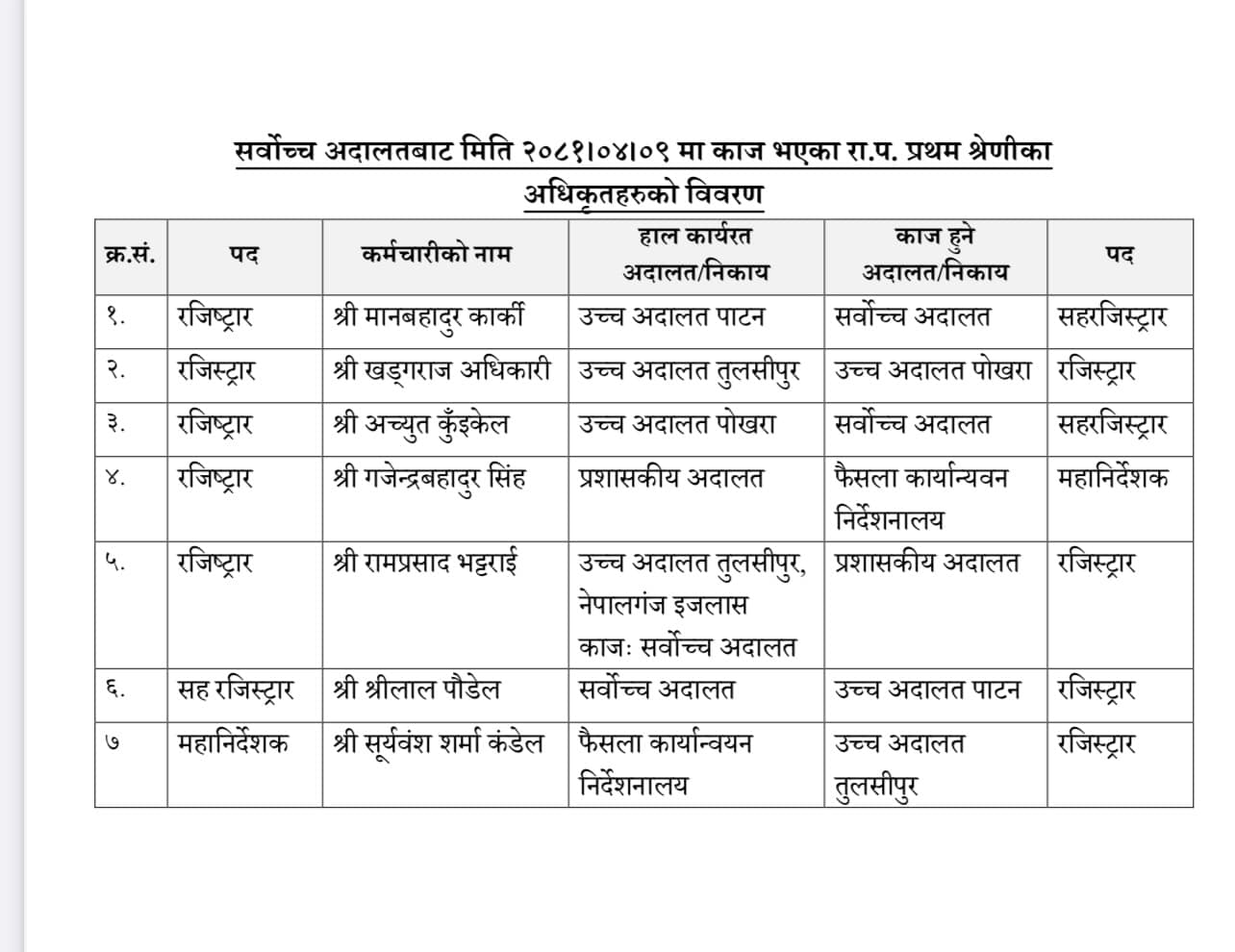उच्च अदालत तुलसीपुरका रजिस्ट्रार उच्च अदालत पोखरामा सरुवा भएका छन् भने उच्च अदालत पोखराका रजिस्ट्रार अच्युत कुइँकेल सर्वोच्च पठाइएका छन्।