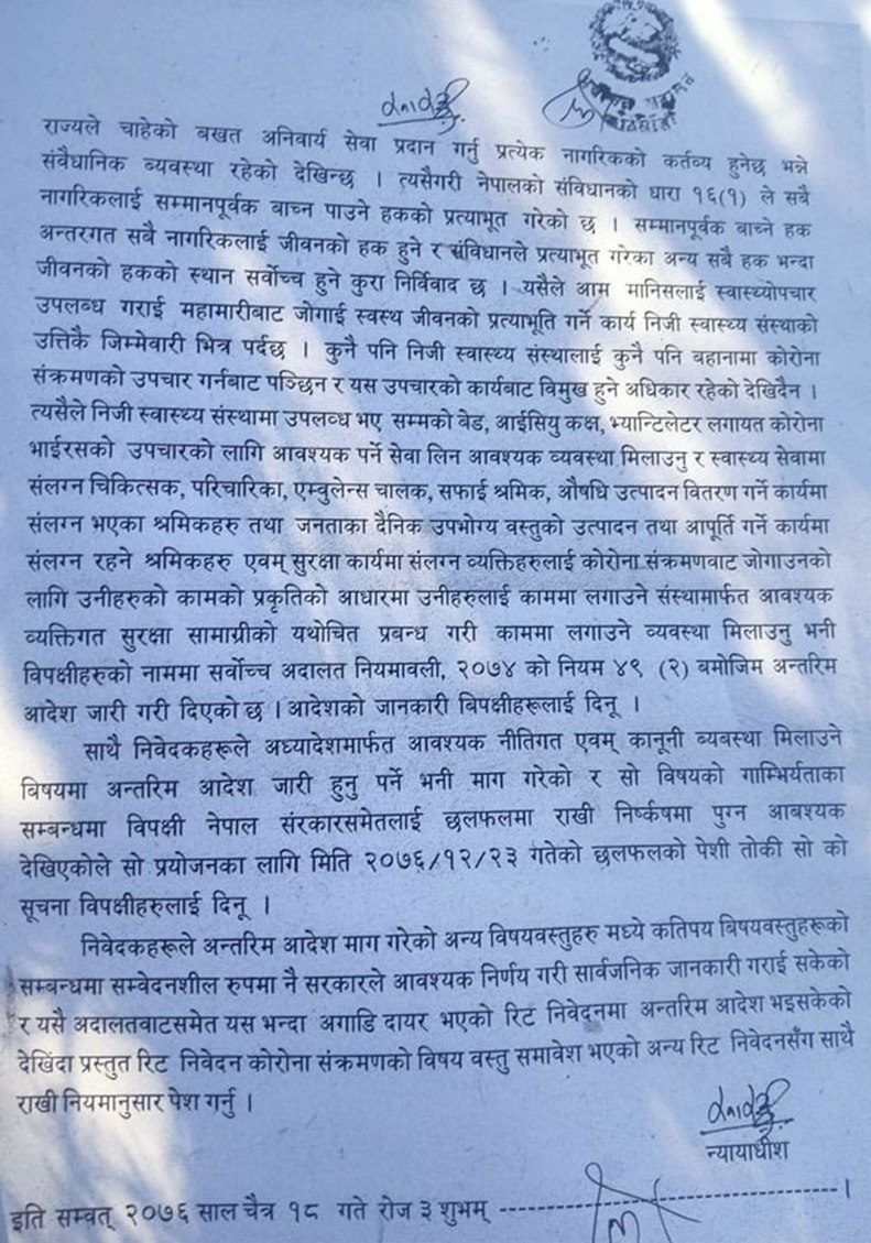 कानून व्यवसायीहरु पुष्पराज पौडेल र सरोजकृष्ण घिमिरेले दायर गरेको निवेदनमाथिको सुनुवाई गर्दै न्यायाधीश मनोजकुमार शर्माको इजलासले क्षमताको अधिकतम् उपभोग गरी कोभिड–१९ का बिरामीको उपचार गर्न आदेश दिएको हो । ‘कुनै पनि निजी स्वास्थ्य संस्थालाई कुनै पनि बहानामा कोरोना संक्रमितको उपचारबाट पन्छिन र उपचारबाट बिमुख बनाउन मिल्ने देखिदैन,’ आदेशमा भनिएको छ, ‘त्यसैले निजी स्वास्थ्यमा उपलब्ध भएसम्मको बेड, आईसीयू कक्ष, भेन्टिलेटर लगायतका उपचारका लागि आवश्यक पर्ने सेवा लिन आवश्यक व्यवस्था मिलाउनु ।’