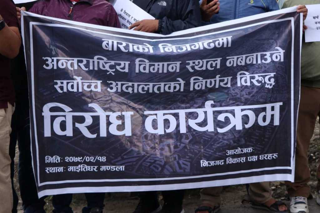 काठमाण्डु – सर्वोच्च अदालतले बाराको निजगढमा प्रस्तावित दोश्रो अन्तर्राष्ट्रिय विमानस्थल नबनाउन आदेश दिएको विरोधमा माइतीघरमा प्रदर्शन भएको छ । निजगढ विकास पक्षधरहररूको आयोजनामा माईतीघरमा सर्वोच्चको निर्णयविरुद्ध शनिबार प्रदर्शन भएको हो ।