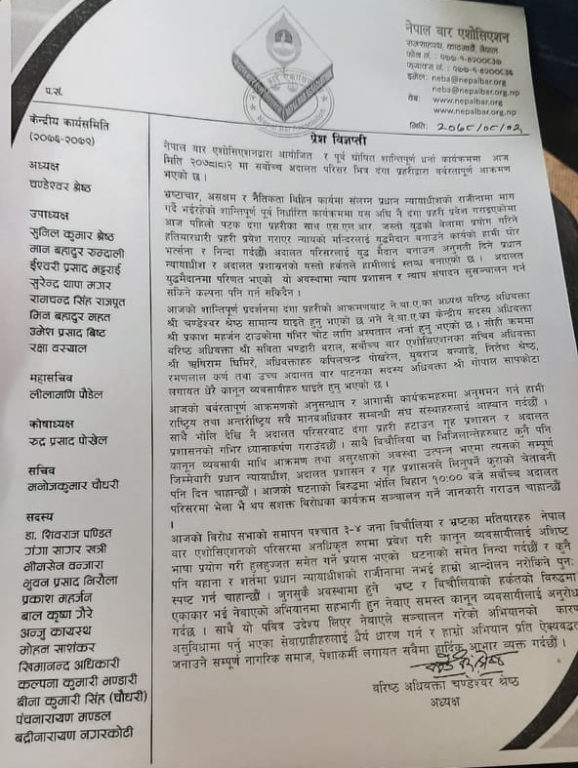नेपाल बार एसोसियसनका अध्यक्ष चण्डेश्वर श्रेष्ठले सर्वोच्च अदालत परिसरमा दंगा प्रहरीको प्रवेश बन्द गर्न माग गरेका छन् । उनले बिहीबार विज्ञप्ति जारी गर्दै त्यसो नगरिए उक्त घटनालाई अन्तर्राष्ट्रियकरण गर्ने चेतावनी दिएका छन् । प्रधानन्यायाधीश चोलेन्द्रशमशेर जबराको राजीनामा माग्दै नेपाल बार चरणबद्ध आन्दोलनमा छ ।