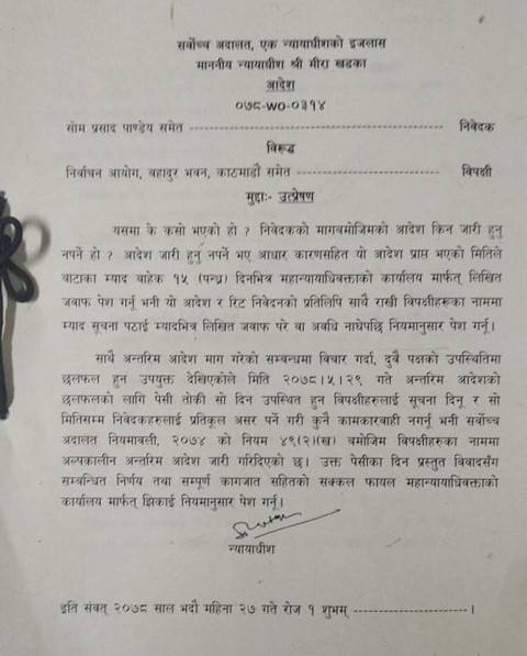 नेकपा एसका दुई जना सांसदलाई भदौ २९ गतेसम्म कारबाही नगर्न सर्वोच्च अदालतको आदेश