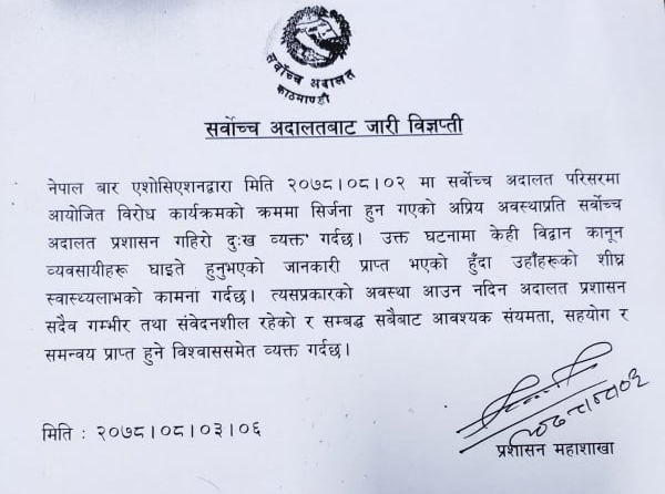 ‘नेपाल बार एसोसिएसनद्वारा मिति २०७८।०८।०२ मा सर्वोच्च अदालत परिसरमा आयोजित विरोध कार्यक्रमको क्रममा सिर्जना हुन गएको अप्रिय अवस्थाप्रति सर्वोच्च अदालत प्रशासन गहिरो दुःख व्यक्त गर्दछ । उक्त घटनामा केही विद्वान कानुन व्यवसायीहरू घाइते हुनुभएको जानकारी प्राप्त भएको हुँदा उहाँहरूको शीघ्र स्वास्थ्यलाभको कामना गर्दछ,’ सर्वोच्चको विज्ञप्तिमा उल्लेख छ, ‘त्यसप्रकारको अवस्था आउन नदिन अदालत प्रशासन सदैव गम्भीर तथा संवेदनशील रहेको र सम्बद्ध सबैबाट आवश्यक संयमता, सहयोग र समन्वय प्राप्त हुने विश्वाससमेत व्यक्त गर्दछ ।’
