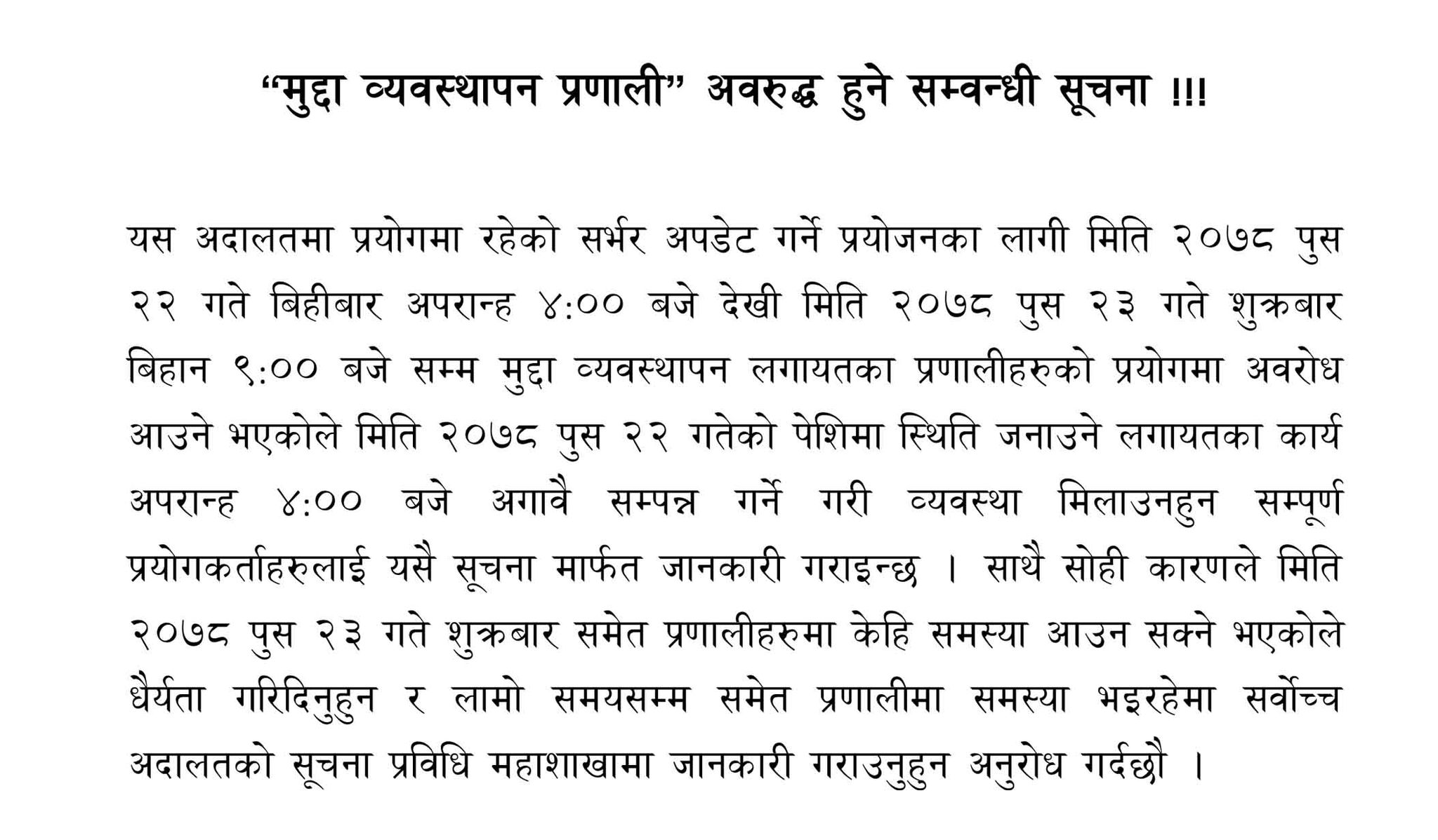 अदालतमा प्रयोग रहेको सर्भर अपडेट गर्ने प्रयोजनका लागि बिहीबार अपरान्ह ४ बजेदेखि शुक्रबार बिहान ९ बजेसम्म मुद्दा व्यवस्थापनलगायतका प्रणालीहरुको प्रयोगमा अवरोध आउने भएको जनाउँदै सर्वोच्चले २२ पुसको पेसीमा स्थिति जनाउने लगायतका कार्य अपरान्ह ४ बजे अगावै सम्पन्न गर्ने गरी व्यवस्था मिलाउन निर्देशन दिएको छ ।