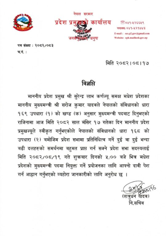 प्रदेश प्रमुख कार्यालयले बुधबार मुख्यमन्त्री सरोजकुमार यादवको राजीनामा स्वीकृत गरेको जानकारी गराउँदै नयाँ सरकार निर्माण गर्नका लागि दलहरूलाई आह्वान गरेको छ ।