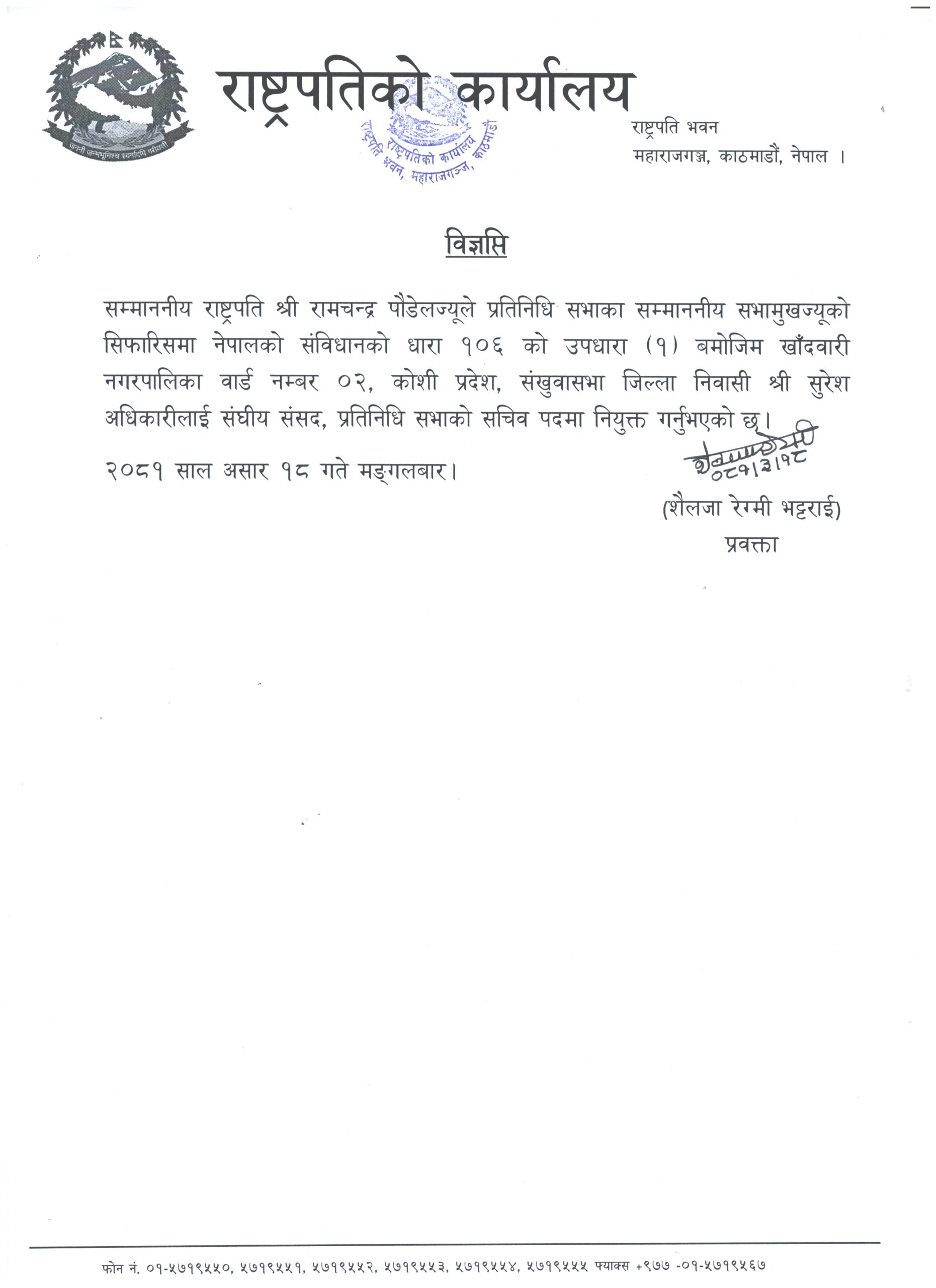 मंगलबार अधिकारीलाई संविधानको धारा १०६ उपधारा (१) बमोजिम नियुक्त गरिएको राष्ट्रपति कार्यालयले जनाएको छ ।