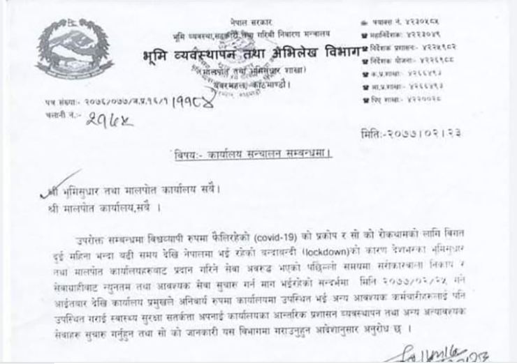 काठमाडौं – सरकारले कोरोना भाइरस रोकथामको लागि लगाइएको लकडाउनको समयभित्र नै देशभरका भूमिसुधार र मालपोत कार्यालय खुल्ने भएको छ ।