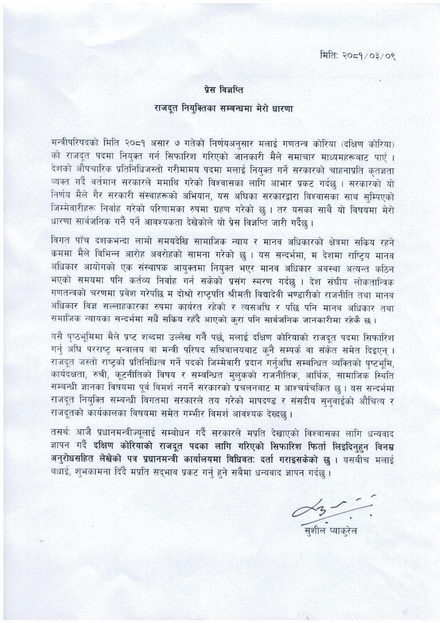विज्ञप्तिमा उनले लेखेका छन्, ‘आजै प्रधानमन्त्रीलाई सम्बोधन गर्दै सरकारले मप्रति देखाएको विश्वासका लागि धन्यवाद ज्ञापन गर्दै दक्षिण कोरियाको रावदूत पदका लागि गरिएको सिफारिस फिर्ता लिइदिनहुन विनम्र अनुरोधसहित लेखेको पत्र प्रधानमन्त्री कार्यालयमा विधिवत दर्ता गराइसकेको छु ।’