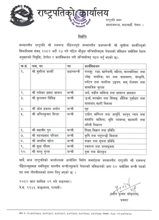 राष्ट्रपति रामचन्द्र पौडेलले आईतबार प्रधानमन्त्री कार्कीको सिफारिसमा नयाँ मन्त्रीहरूको नियुक्ति, हेरफेर र कार्यविभाजन गर्दै मन्त्रिपरिषद पुनर्गठन गरेका हुन् ।
