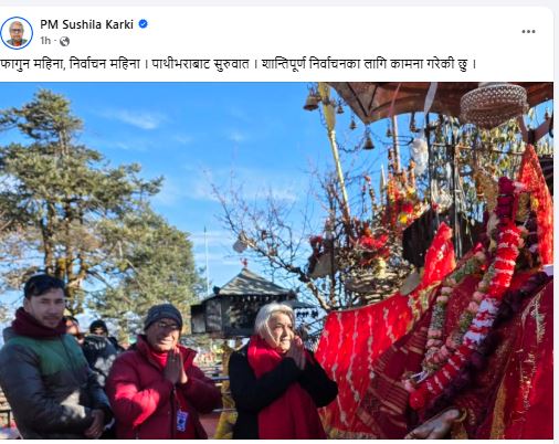 समाजिक सञ्जाल फेसबुकमा पाथीभरा दर्शन गरेको तस्विर सार्वजनिक गर्दै प्रधानमन्त्री कार्कीले फागुन महिना निर्वाचनको महिना भएकाले पाथीभरा मातासँग शान्तिपूर्ण निर्वाचनका लागि कामना गरेको उल्लेख गरेकी हुन् ।