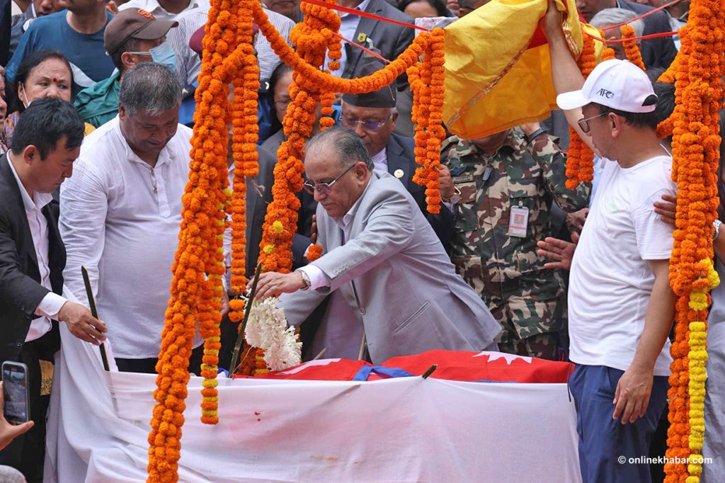 सुवास नेम्वाङकाे पार्थीव शरीरमा राष्ट्रिय झन्डा ओढाएर प्रधानमन्त्रीद्वारा सम्मान व्यक्त