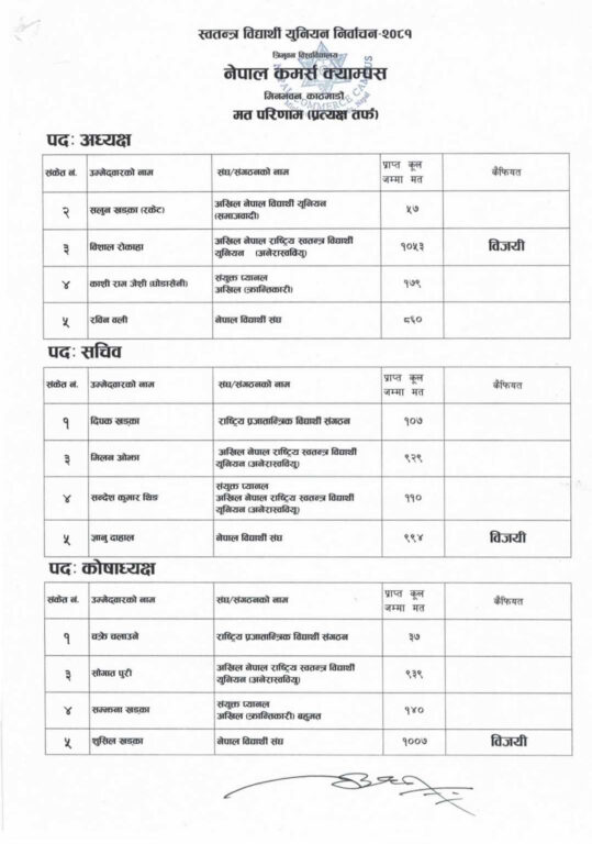 सचिव पदमा नेविसंघकी ज्ञानु दाहाल विजयी भइन् । कोषाध्यक्षमा पनि नेविसंघका उम्मेदवार विजयी भए ।