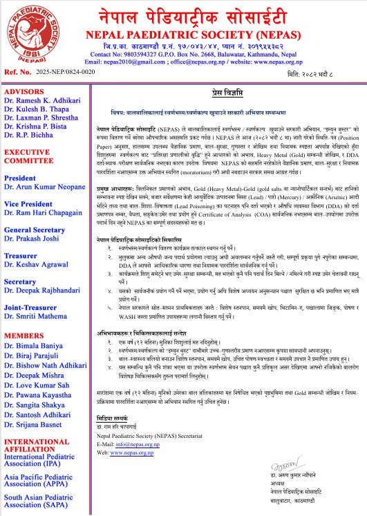 नेपासका अध्यक्ष डा. अरुणकुमार न्यौपानेले विज्ञप्ति जारी गर्दै औषधि दर्ता, व्याच परीक्षण र नियामक पारदर्शिता सार्वजनिक नगरी बालबालिकालाई यस्तो औषधि खुवाउनु असुरक्षित हुने बताएका छन्।“उपलब्ध वैज्ञानिक प्रमाण र बालसुरक्षा सम्बन्धी मापदण्ड अपर्याप्त देखिएका छन्। स्वर्णकल्पबाट रोग प्रतिरोधात्मक क्षमता वृद्धि हुने आधार भेटिएको छैन,” विज्ञप्तिमा भनिएको छ।