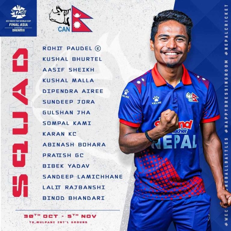 अन्तिम १५ मा लेग स्पिनर सन्दीप लामिछानेलाई समेटिएकाे छ भने स्पिनर सूर्य तामाङ, श्याम ढकाल, सागर ढकाल र युवा ब्याटर लोकेश बम बाहिरिएका छन् । यसअघि परिवारलाइ समय दिने भन्दै लामिछानेले त्रिकोणात्मक टी-२० आई सिरिज खेलेका थिएनन्।
