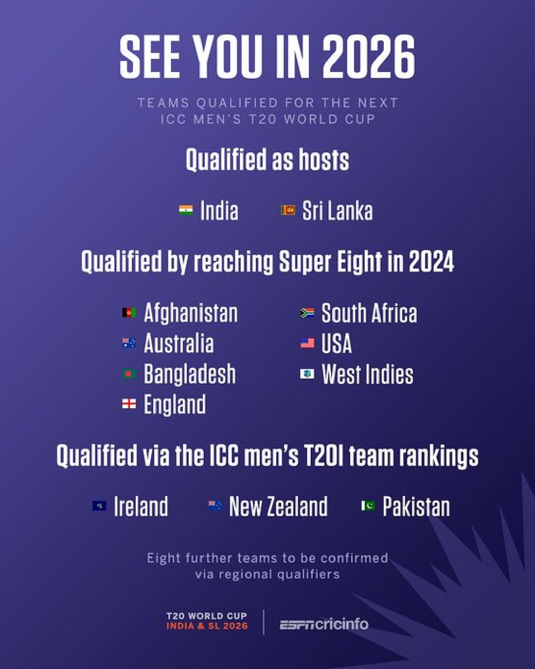 २०२६को टी-२० विश्वकप भारत र श्रीलंकामा हुनेछ । आयोजक राष्ट्रको हैसियतले भारत र श्रीलंकाले स्वतः प्रवेश पाएका छन् । २०२४ को टी-२०को सुपर-८मा प्रवेश पाएका आठवटै टीमले पनि आगामी विश्वकप खेल्ने छन् । जसमध्ये भारत र श्रीलंका आयोजक नै हुन् ।