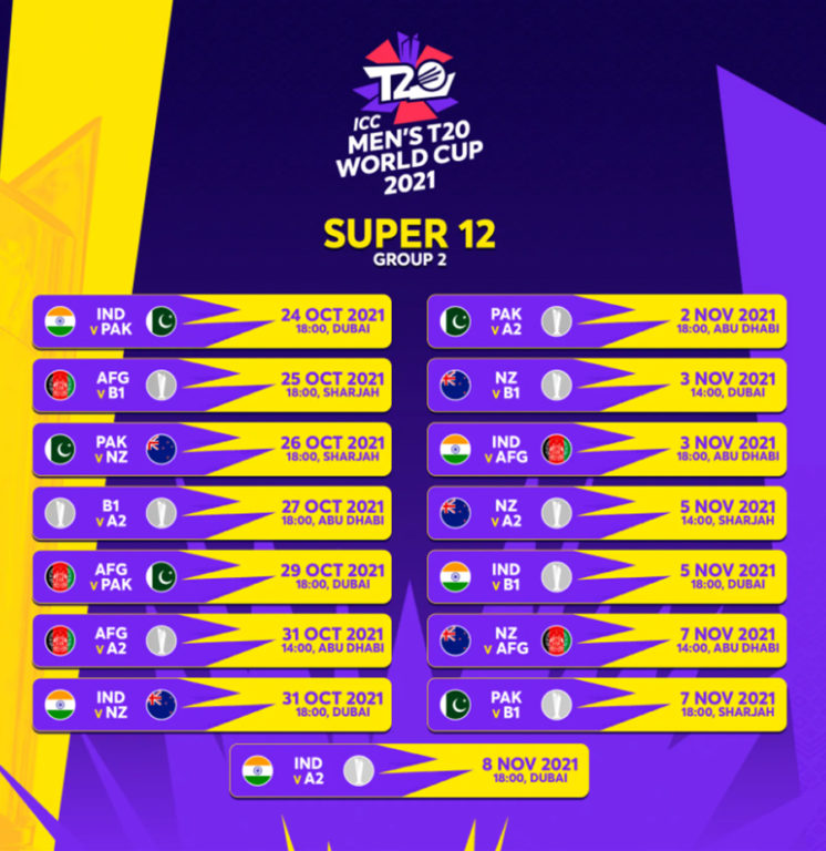 सुपर–१२ को समूह २ मा रहेको भारतले पाकिस्तानसँग अक्टोबर २४ मा प्रतिस्पर्धा गर्नेछ । भारत र पाकिस्तानबीचको खेल दुबईमा हुनेछ ।
