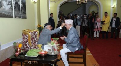 काठमाण्डु – प्रधानमन्त्री केपी शर्मा ओलीले राष्ट्रपति रामचन्द्र पौडेलबाट टीका र जमरा ग्रहण गरेका छन्
