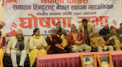 काठमाण्डु – नेपाली कांग्रेसको आसन्न महासमिति बैठकको पूर्व सन्ध्यामा सनातन हिन्दूराष्ट्र नेपाल स्थापना महाअभियानको घोषणा