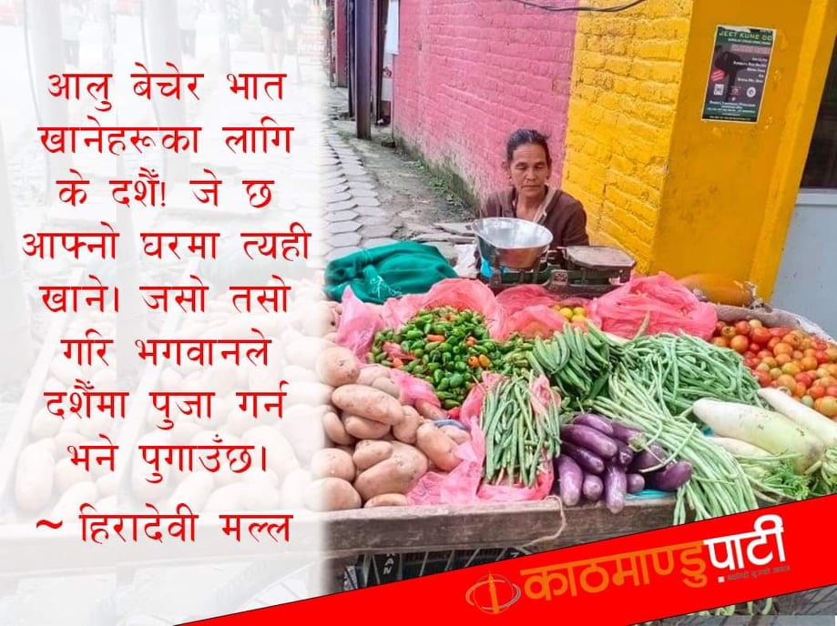 विदेशिएका नेपालीहरु पनि दशैँ मान्न घर फर्किएका छन् । तर काठमाण्डुको स्वयम्भुमा बस्ने ४५ बषकी हिरादेवीलाई भने दशौको कुनै रौनकले छोएको छैन । उनि आफ्नो दैनिक कर्ममै जुटिरहेकी छन् । बिहानै उठ्यो कालिमाटी पुगेर तरकारी ल्यायाे अनि ठेलागाडामा राखेर स्वयम्भुमा बेच्यो । व्यापार राम्रो भएको दिन नै उनकालागि दशैँ हो । यस्ता चाडपर्वले उनको जिवनमा कुनै रंग भर्न सक्दैन ।