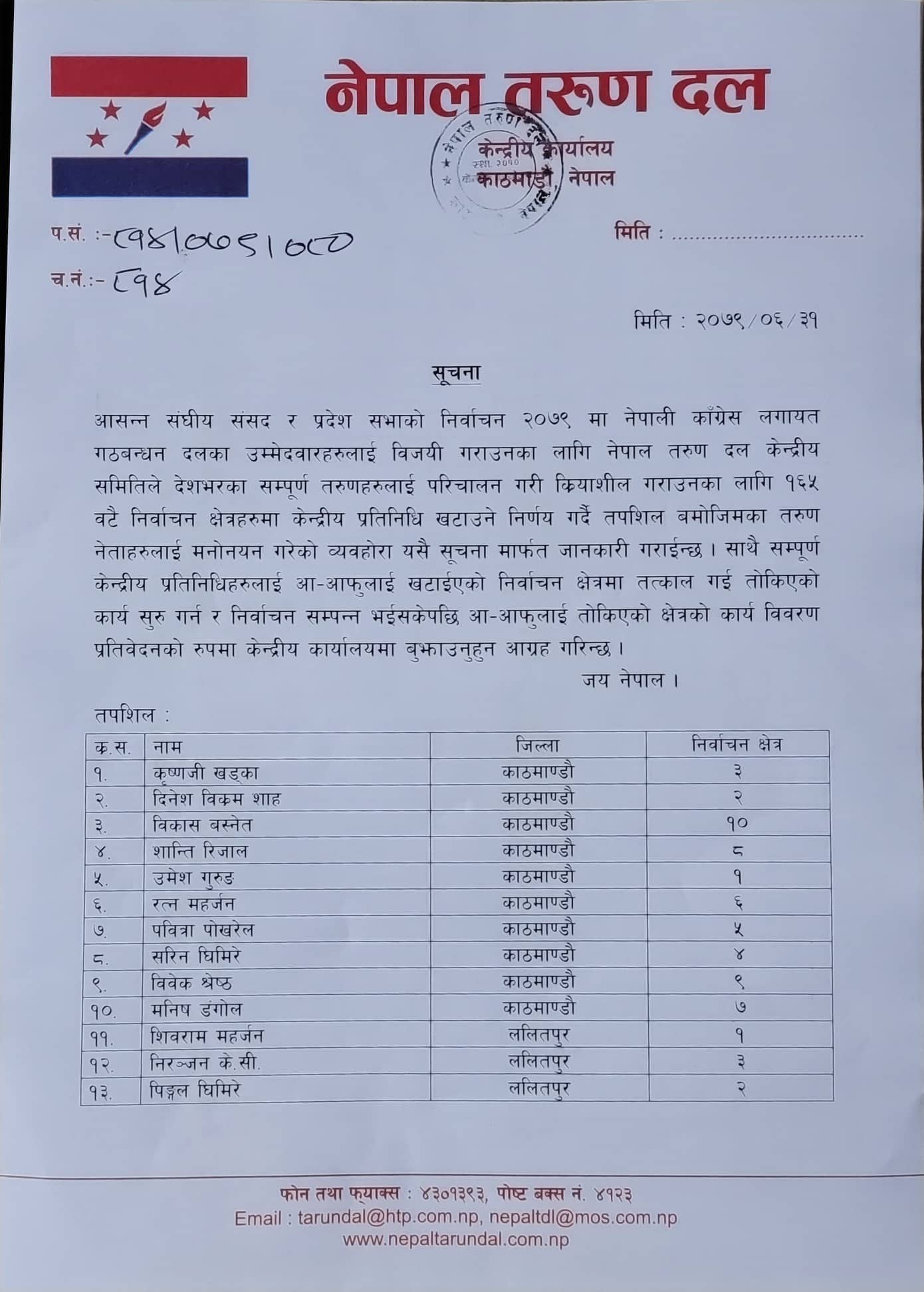 साथै सम्पूर्ण केन्द्रीय प्रतिनिधिहरूलाई आफूलाई खटाइएको निर्वाचन क्षेत्रमा तत्काल गई तोकिएको कार्य सुरु गर्न र निर्वाचन सम्पन्नपछि कार्यविवरण प्रतिवेदन केन्द्रीय कार्यालयमा बुझाउन निर्देशन गरिएको छ ।