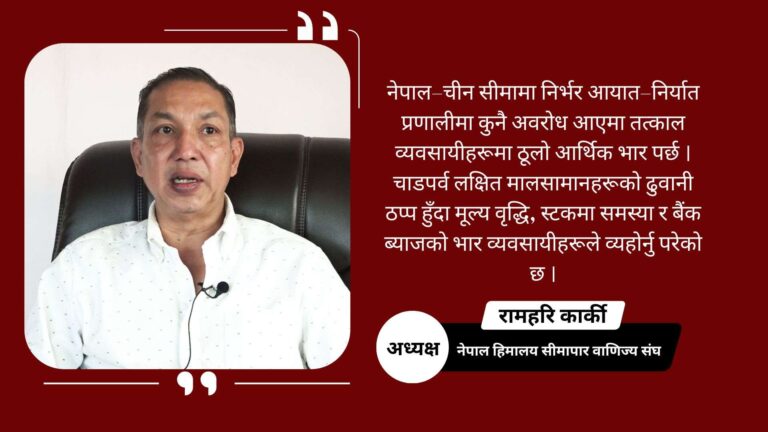 ‘तातोपानी नाकामा हालको स्थिति जटिल छ । न्यालम क्षेत्रको इको भन्ने क्षेत्रमा बारम्बार पहिरो आएपछि नाका ठप्प भएको छ । यस क्षेत्रमा १२ देखि १३ सय कन्टेनर रोकिएका छन, जसको मूल्य अर्बौं रुपैयाँमा पुग्ने अनुमान गरिएको छ । यो चाडपर्व लक्षित सामान समयमै नेपाल ल्याउन नसकिए व्यवसायीले बैंकको ब्याज र गोदाम भाडा भुक्तानी गर्न अझ बढी चुनौती भोग्नुपर्ने छ । त्यसले उनिहरुमाथि आर्थिक भार बढ्ने देखिन्छ,’ कार्कीले भने ।