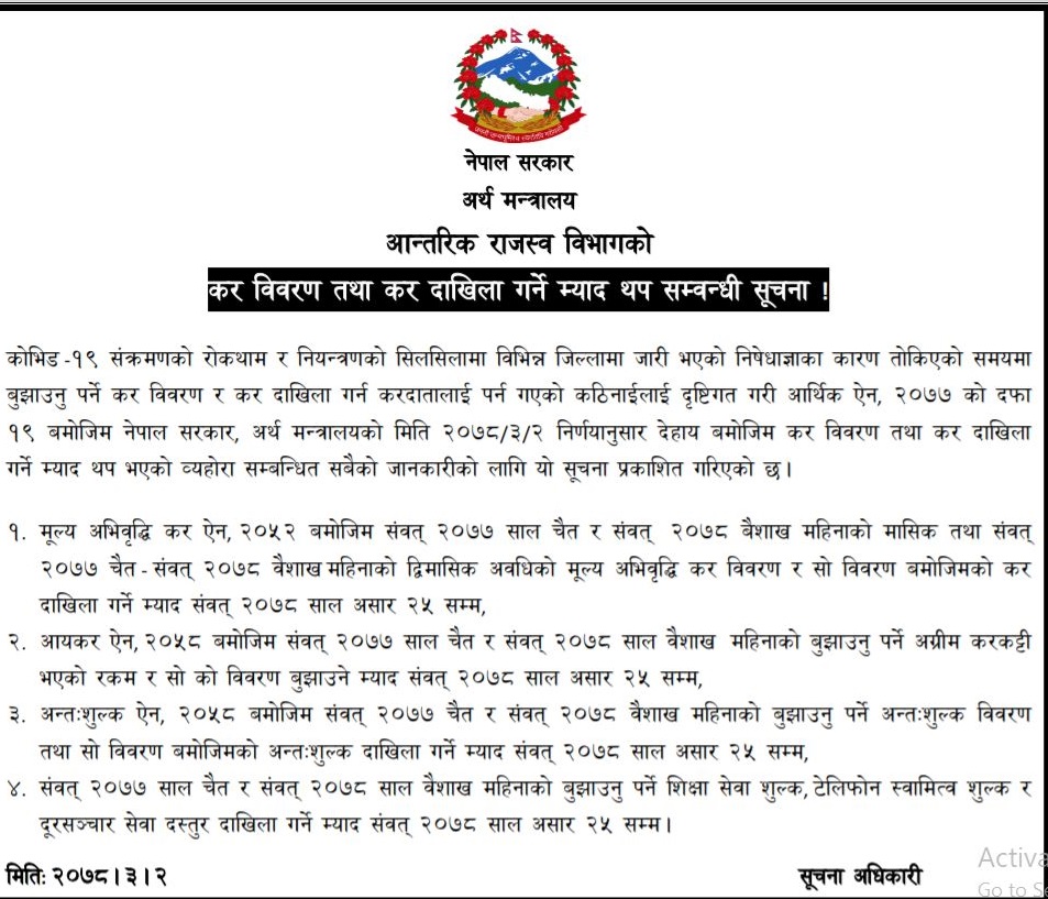 कोरोना भाइरस संक्रमणका कारण विभिन्न जिल्लामा जारी भएको निषेधाज्ञाका कारण तोकिएको समयमा कर बुझाउनुपर्ने विवरण र कर दाखिला गर्न करदातालाई पर्न गएको कठिनाईका कारण समय थप गरिएको विभागले जनाएको छ ।