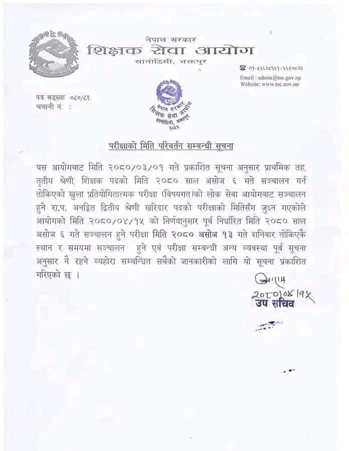 शिक्षक सेवा आयोग प्रावि तहको परीक्षा मिति सर्यो