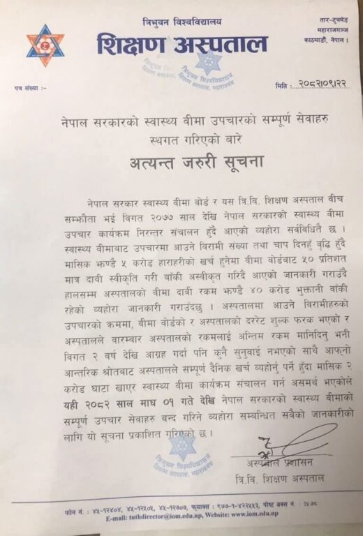 शिक्षण अस्पताल प्रशासनले सूचना सार्वजनिक गर्दै आगामी माघ १ गतेदेखि नेपाल सरकारको स्वास्थ्य बीमा अन्तर्गतका सम्पूर्ण उपचार सेवा बन्द गरिने जानकारी दिएको हो ।