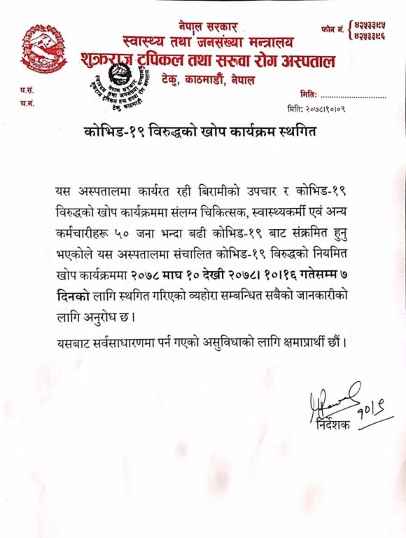 टेकु अस्पतालले आइतबार एक सूचना जारी गर्दै भाेलि साेमबारदेखि ७ दिनका लागि कोरोना खोप कार्यक्रम स्थगित गरिएकोजानकारी दिएको हो ।