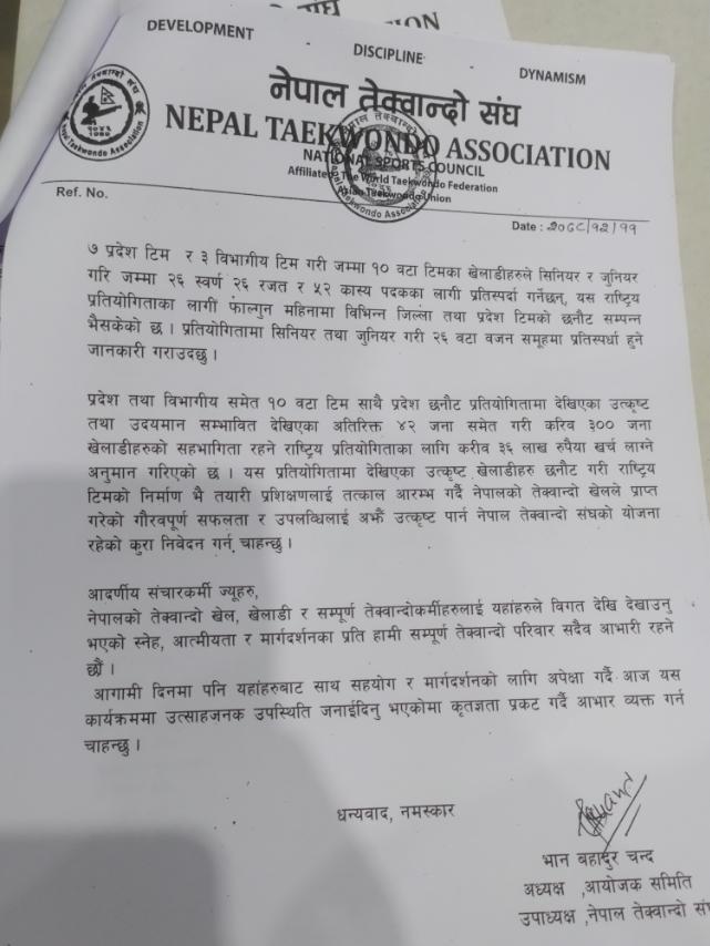 यस राष्ट्रिय प्रतियोगिताबाट आगामी दक्षिण एसियाली खेल लगायत विभिन्न अन्तराष्ट्रिय प्रतियोगिताको लागि खेलाडीहरुको पहिचान गर्दै तयारी पक्षलाई द्रुत गतिमा सञ्चालन गर्ने योजना रहेको तेक्वान्दो संघले जनाएको छ ।