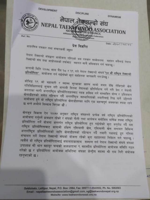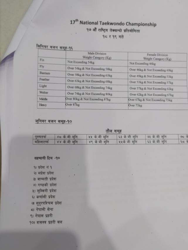 काठमाण्डु – नेपाल तेक्वान्दो संघले १७ औं राष्ट्रिय तेक्वान्दो प्रतियोगिता आयोजना गर्ने भएको छ ।