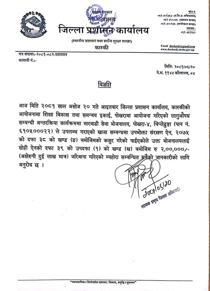 भोजनालयले परिमाणभन्दा निकै कम सामान आपूर्ति गरेपछि प्रशासनले उपभोक्ता संरक्षण ऐन, २०७५ को दफा ३८ को खण्ड (ङ) बमोजिमको कसूर गरेको भन्दै दुई लाख रुपैयाँ जरिवाना तिराएको छ ।