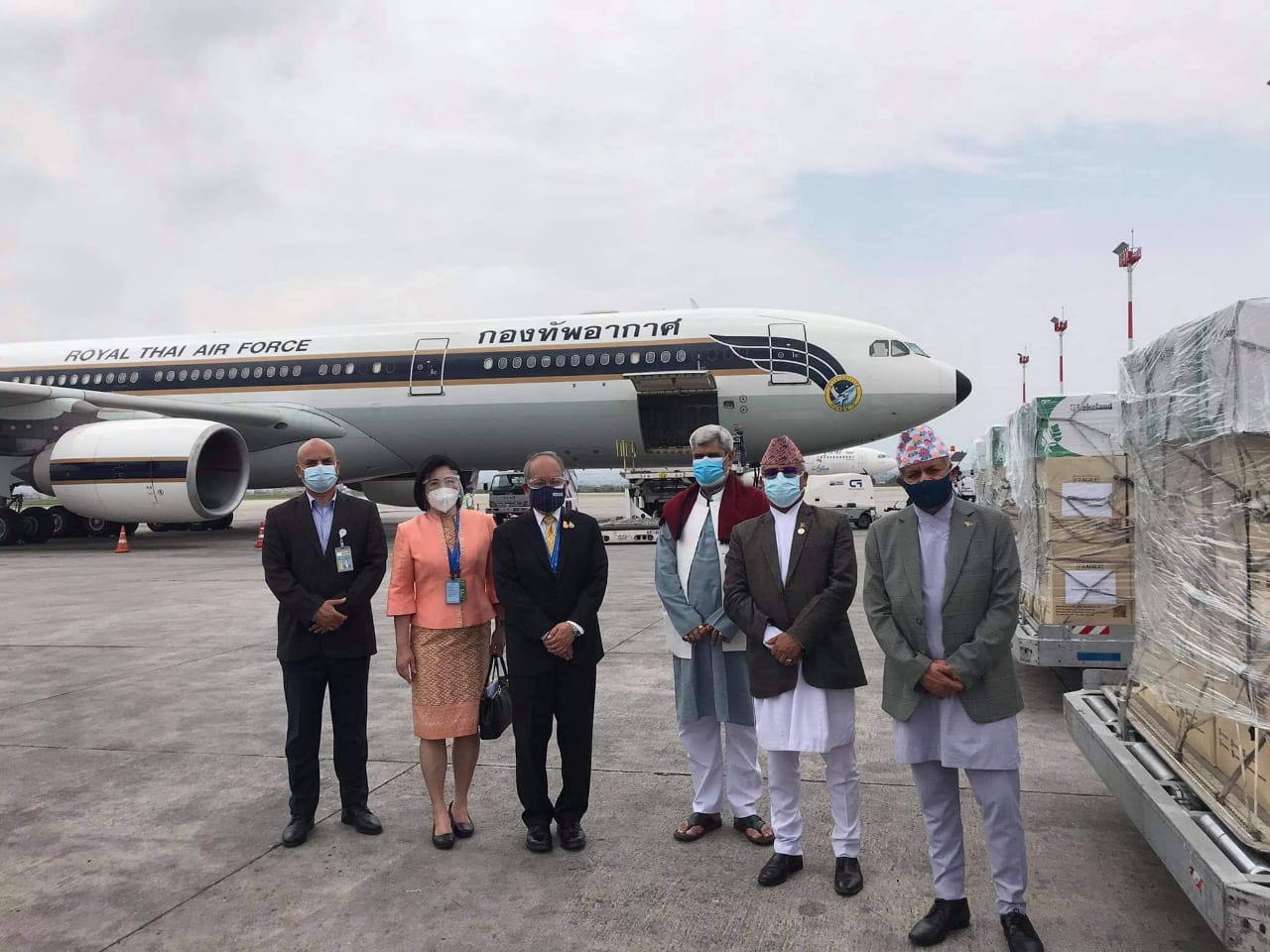 थाइल्यान्डका राजाले सर्जिकल मास्क, पिपिपई सेट, फेस सिल्ड, र्यापिड एन्टिजेन टेष्ट किट, अक्सिमिटर स्वास्थ्य सामग्री पठाएका हुन् ।