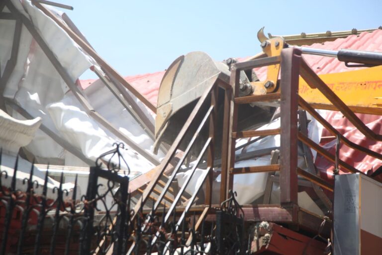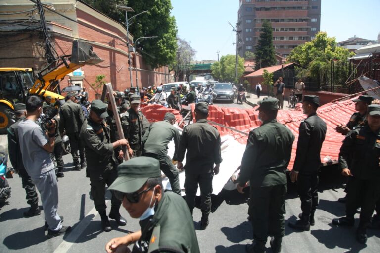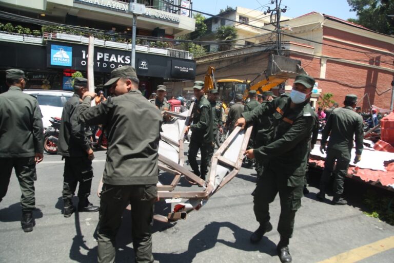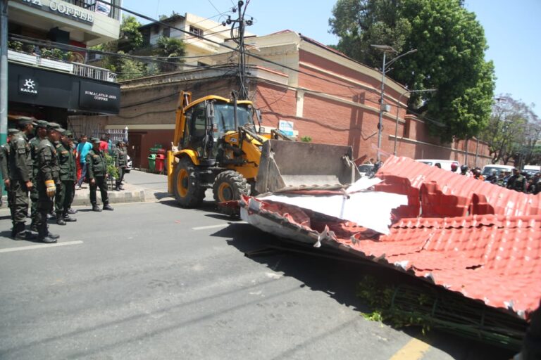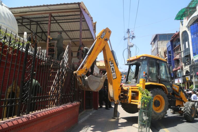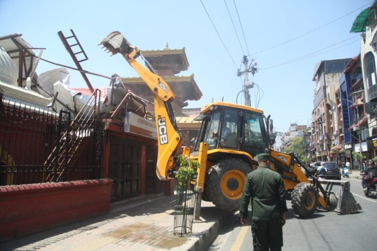 महानगरपालिका–२७ त्रिदेवी मन्दिर ठमेलमा बनेको अनाधिकृत संरचनामा नगर प्रहरीले डोजर चलाएको हो।