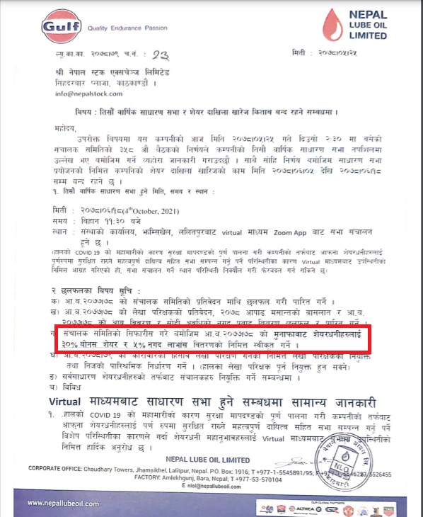 काठमाण्डु – नेपाल ल्यूब आयल लिमिटेड (गल्फ)को तीसौं वार्षिक साधारणसधा असोज १८ गते हुने भएको छ ।