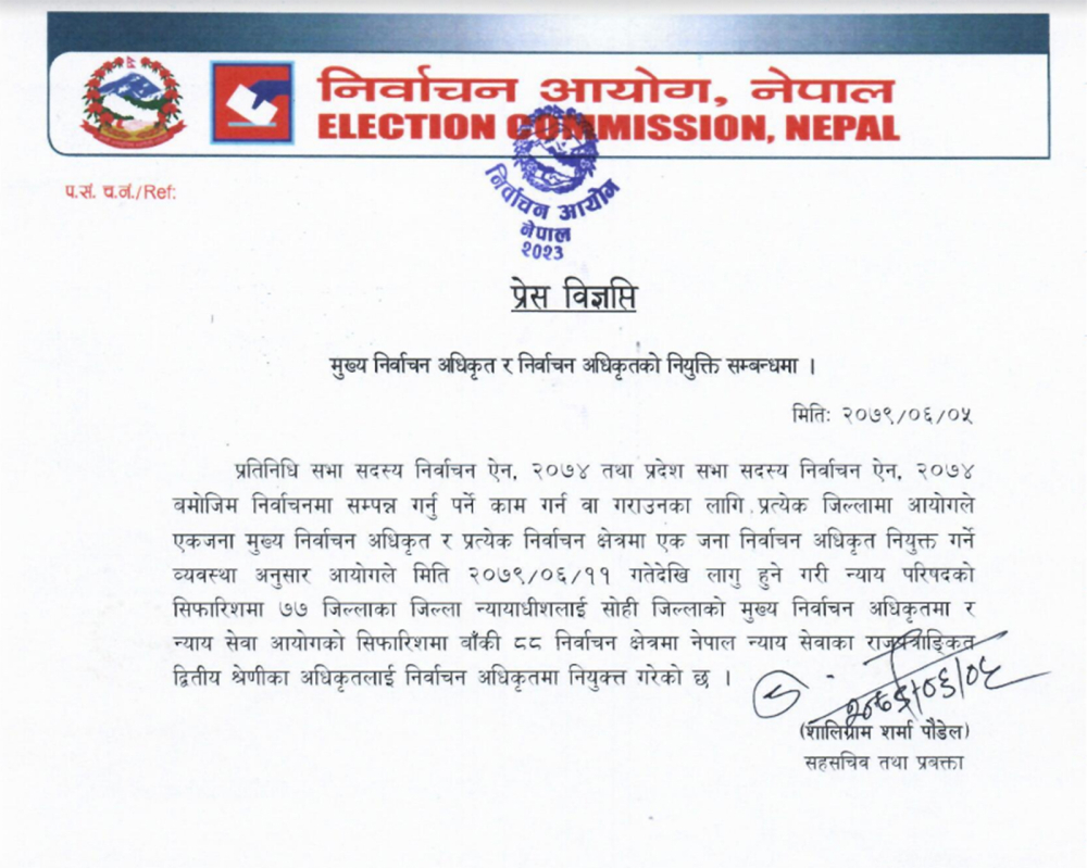 आयोगले असोज ११ गतेदेखि लागू हुने गरी न्याय परिषद्को सिफारिसमा ७७ जिल्लाका जिल्ला न्यायाधीशलाई सोही जिल्लाको मुख्य निर्वाचन अधिृकत र न्याय सेवा आयोगको सिफारिसमा बाँकी ८८ निर्वाचन क्षेत्रमा नेपाल न्याय सेवाका राजपत्राङ्कित द्वितीय श्रेणीका अधिकृतलाई निर्वाचन अधिकृतमा नियुक्त गरेको आयोगले जनाएको छ ।