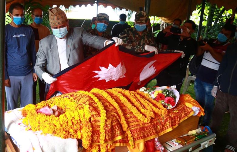 रक्षामन्त्री पोखरेलले आज उनको निवास लैनचौरमा राष्ट्रिय झण्डा ओढाइ नेपाल सरकारका तर्फबाट श्रद्धाञ्जलि व्यक्त गरेका हुन् ।