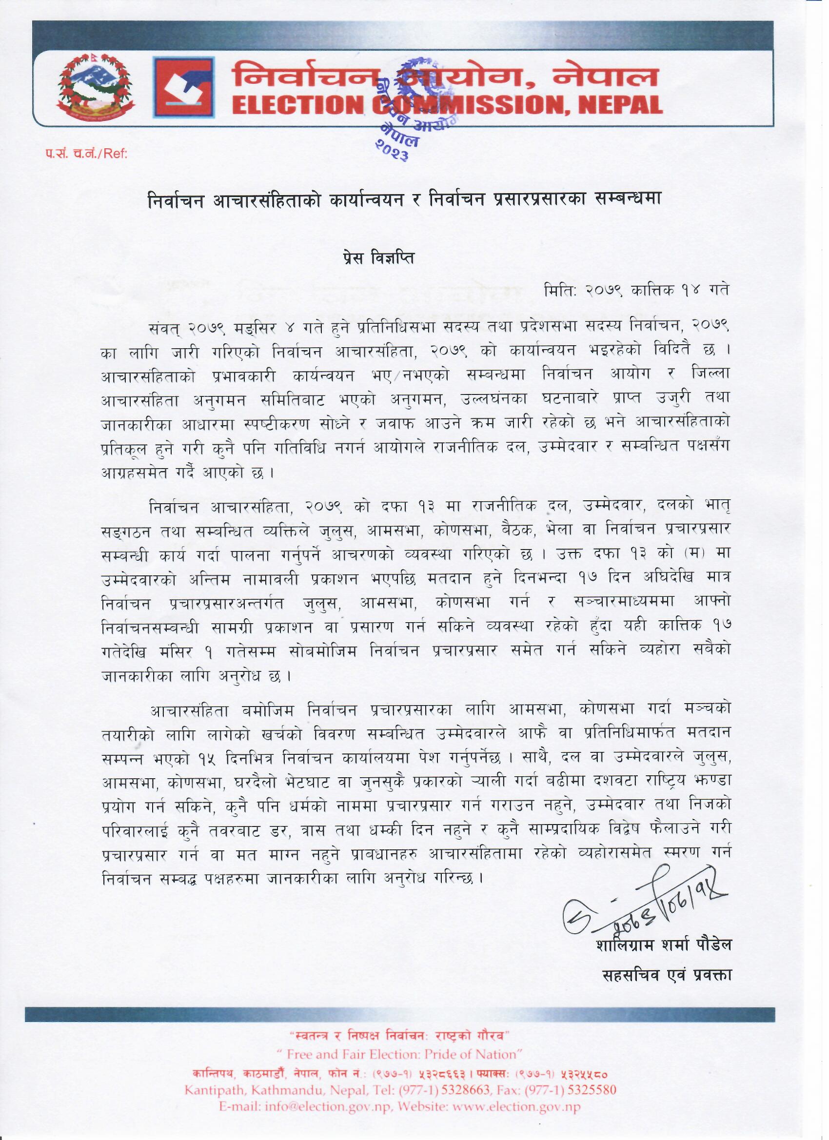 ‘मतदान हुने दिनभन्दा १७ दिन अघिदेखि मात्र निर्वाचन प्रचार प्रसार अन्तर्गत जुलुस, आमसभा, कोणसभा गर्न र सञ्चारमाध्यममा आफ्नो निर्वाचन सम्बन्धी सामग्री प्रकाशन वा प्रसारण गर्न सकिने व्यवस्था रहेको हुँदा यही कात्तिक १७ गतेदेखि मंसिर १ गतेसम्म सो बमोजिम निर्वाचन प्रचारप्रसार समेत गर्न सकिने व्यहोरा सबैको जानकारीका लागि अनुरोध छ,’ निर्वाचन आयोगले आज एक विज्ञप्ति जारी गरी भनेको छ ।