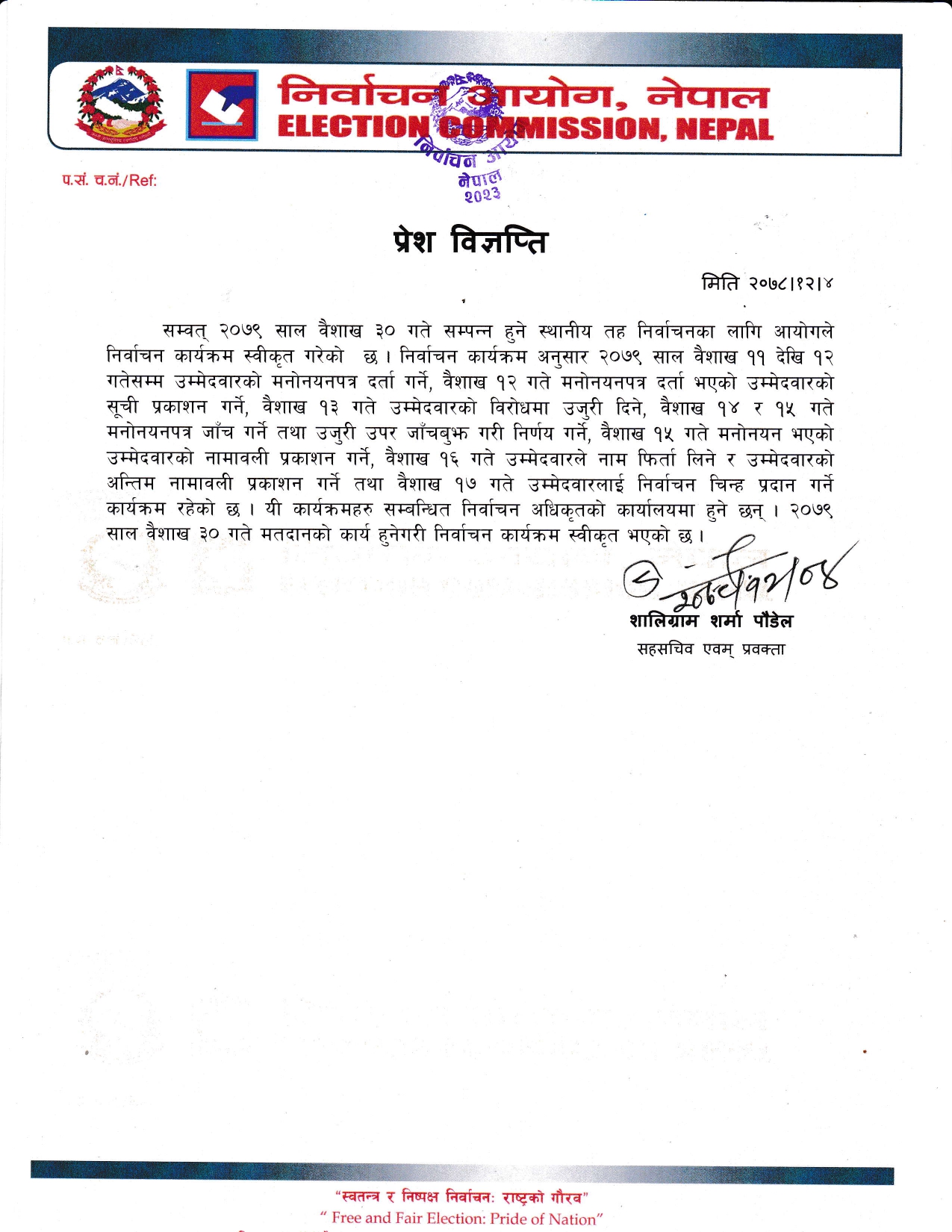 यी कार्यक्रमहरू सम्बन्धित निर्वाचन अधिकृतको कार्यालयमा हुने प्रवक्ता पौडेलले बताए। वैशाख ३० गते मतदानको कार्य हुनेगरी निर्वाचन कार्यक्रम स्वीकृत गरेको हो ।