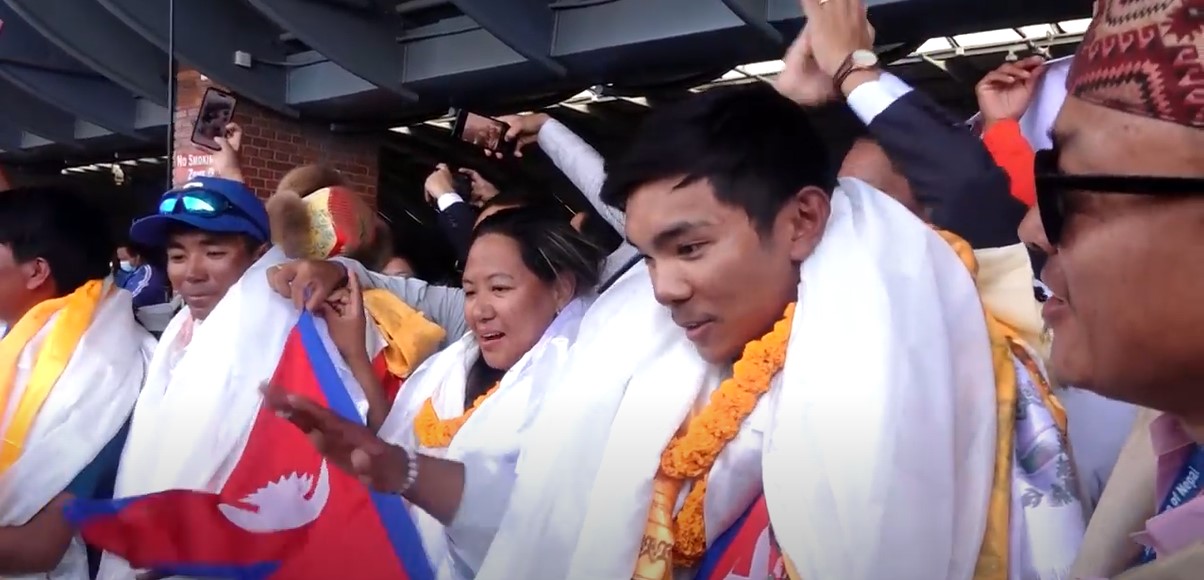 तिब्बतको सिसापाङ हिमालको सफल आरोहण गरी विश्व कीर्तिमान कायम गरेर काठमाडौँ फर्किएका कीर्तिमानी आरोहीलाई त्रिभुवन अन्तर्राष्ट्रिय विमानस्थलमा भव्य स्वागत गरिएको थियो । -रासस