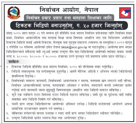 भिडियोमा चुनाव प्रचारप्रसार, आचारसंहिता तथा मतदाता शिक्षा समावेश हुनुपर्नेछ र लिंक आउँदो फागुन ३ देखि १७ गतेभित्र आयोगको इमेलमा पठाउनुपर्नेछ । एक मिनेटसम्मको भिडियो टिकटकका साथै युट्युब र फेसबुकमा पनि राख्नुपर्नेछ ।