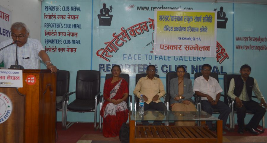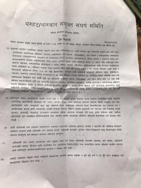 थरुहट-थारुवान संयुक्त संघर्ष समितिले असार १३, १४ र १५ गते जारी गरेको ‘काठमाडौं घोषणा पत्र’ सार्वजनिक गर्न शनिबार राजधानीमा आयोजित पत्रकार सम्मेलनमा पूर्वसांसद चौधरीले यस्तो माग गरेकी हुन्।