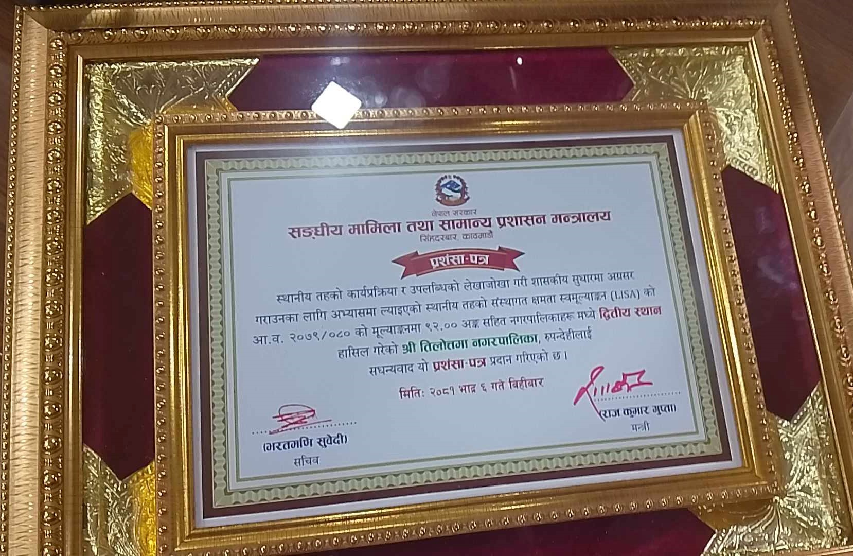 काठमाण्डु – रुपन्देहीको तिलोत्तमा नगरपालिका देशभरकै नगरपालिकामा दोस्रो उत्कृष्ठ नगरपालिका घोषित भएको छ । संघीय मामिला तथा सामान्य प्रशासन मन्त्रालयले आर्थिक वर्ष २०७९/०८० मा गरेको स्थानीय सरकार संस्थागत क्षमता स्वमूल्यांकनमा तिलोत्तमा नगरपालिका नगरपालिकामध्य मुलुकभरकै दोस्रो उत्कृष्ठ नगरपालिका घोषित भएको हो ।