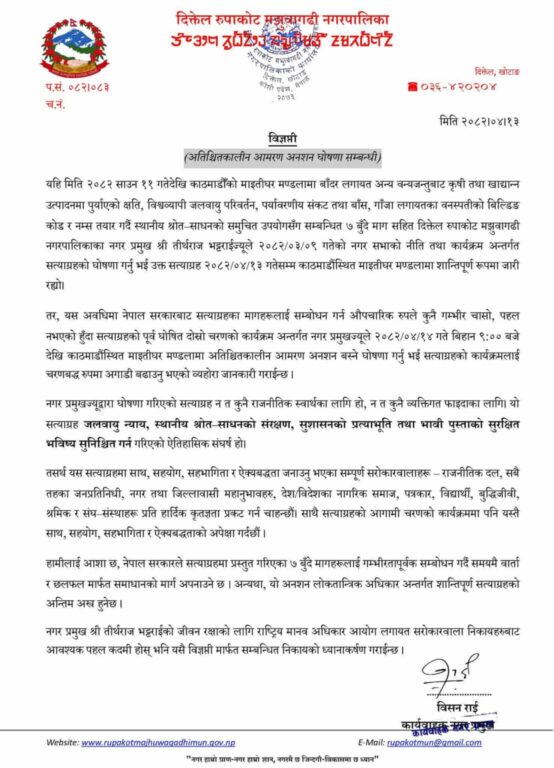 काठमाण्डु – खोटाङको दिक्तेल रुपाकोट मझुवागढीका नगर प्रमुख (मेयर) तीर्थराज भट्टराई भोलि बुधबारदेखि काठमाण्डुको माइतीघरमा अनिश्चित आमरण अनसन बस्ने भएका छन्‌ ।